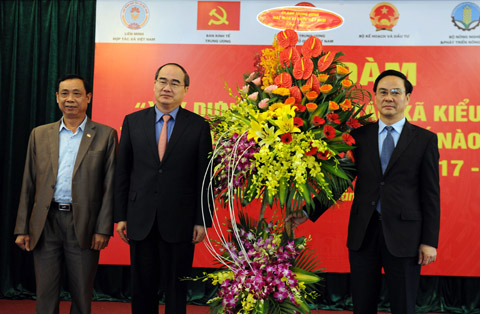 | Politbüromitglied Nguyen Thien Nhan (M.) gratulierte die Koalition der vietnamesischen Genossenschaften zum Gründungstag. (Foto: Hoang Long) |
