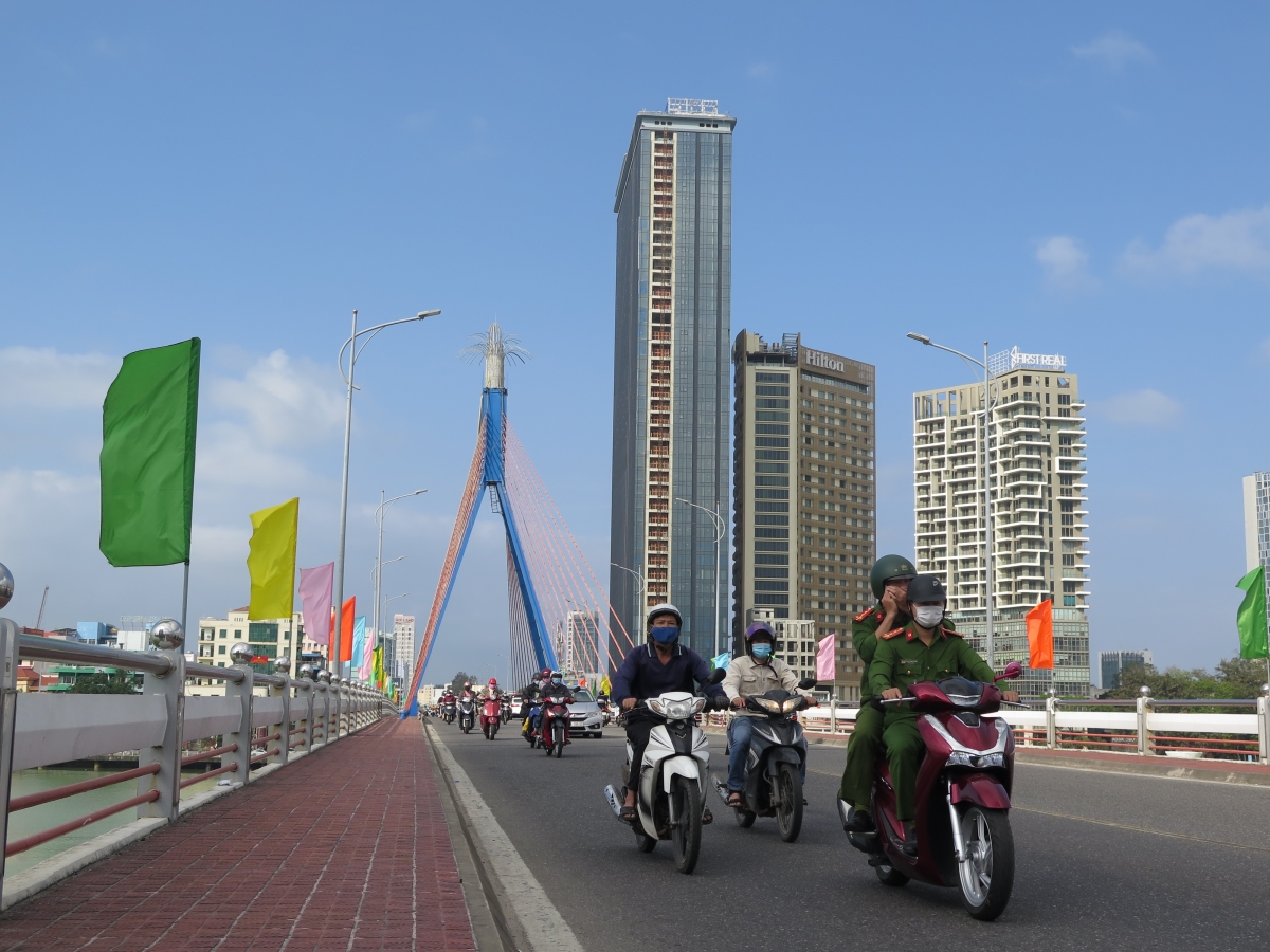 Die Brücke über Han-Fluss in Da Nang wird mit bunten Fahnen dekoriert, um den 13. Parteitag der KPV zu begrüßen. (Foto: VOV) |