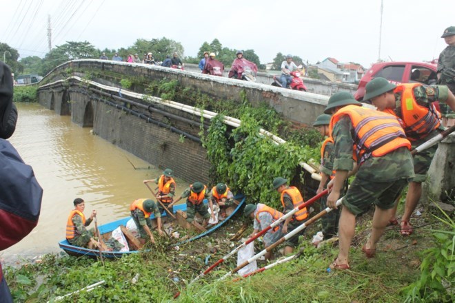 Die Soldaten in der Provinz Thua Thien Hue sind für die Aufräumarbeit nach dem Flut zum Einsatz. |