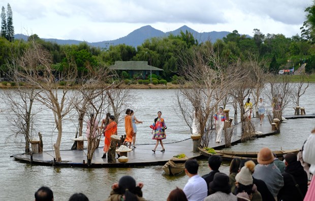 Die Modenschau der Seiden Bao Loc findet auf Xuan Huong-Fluss in Da Lat statt. (Foto: Nguyen Dung/VNA) |
