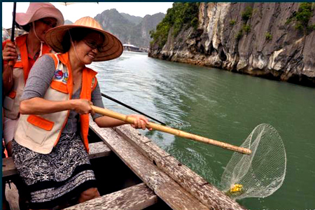 Die Touristen werden in Gruppen aufgeteilt. Sie werden mit Schwimmwesten versorgt und beteiligen sich am Fischfang mit den Fischern. Als erstes zeigen die Fischer den Touristen, wie sie die Netze auswerfen können. Diese Arbeit erfordert Geschick, weil sich sonst die Netze verwirren. Anschließend werden den Touristen gezeigt, wie sie die Netze am Mittag einholen können. Dafür interessieren sich die Touristen sehr. Sie freuen sich darüber, dass sie selbst Fische fangen können. Dazu der Tourist Tran Minh Ha:
