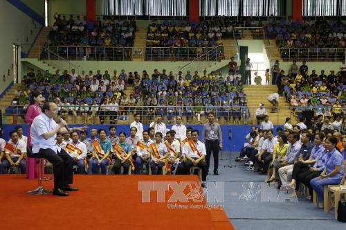 (VOVworld) – Zum Monat der Arbeiter hat der Jugendverband der Hauptstadt Hanoi das Fest “junge Arbeiter begleiten” veranstaltet. Daran nahmen 4000 junge Arbeiterinnen und Arbeiter teil. Ziel des Festes ist, das Engagement des Jugendverbands in Ausbildung, Hilfe, Unterstützung und Begleitung für Arbeiter zu fördern. Während des Festes wurden Geschenke an Arbeiter überreicht und ein Musikprogramm veranstaltet. Trinh Ngoc Tuyen, Arbeiter in der Firma Sumitomo Heavy hat am Fest teilgenommen.