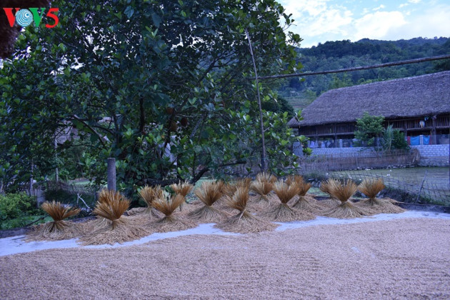 | Vor jedem Pfahlhaus gibt es einen Hof, auf dem man Reis, Erdnüsse und Mais trocknet. |