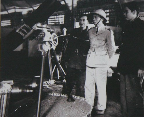 | General Vo Nguyen Giap und Generalleutnant Tran Dai Nghia, Leiter der Waffenbehörde der Armee, bei der Ausstellung vietnamesischer Waffen 1950. |