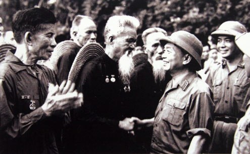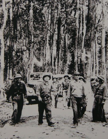 | Präsident Ho Chi Minh und General Oberbefehlshaber Vo Nguyen Giap bei der Kampagne „Bien gioi“ (Grenze) im Jahr 1950. |