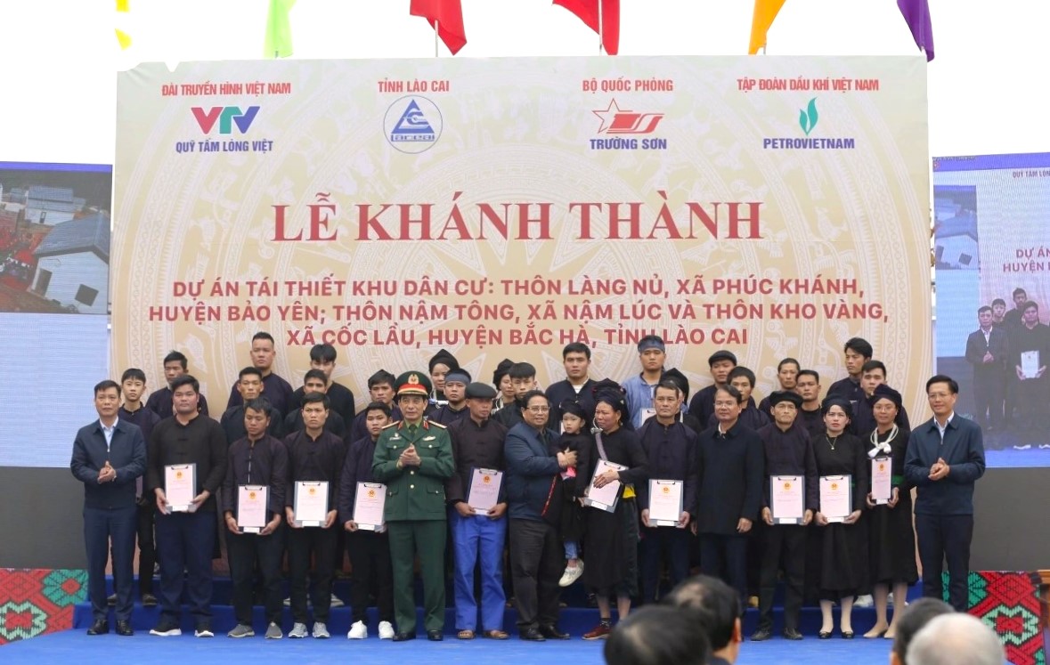 Premierminister Pham Minh Chinh und Verteidigungsminister Phan Van Giang überreichen Landnutzungsurkunde an Bewohner im neuen Siedlungsgebiet. (Foto: chinhphu.vn) |