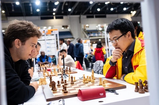 An Tisch Nr. 1 spielte Le Quang Liem gegen den norwegischen „Schachkönig“, Magnus Carlsen, der die Weltrangliste anführt, und verlor nach 42 Zügen.