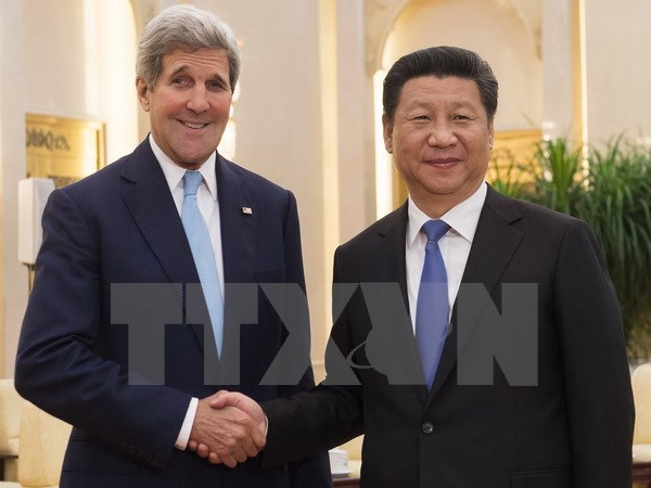 | US-Außenminister John Kerry (l.) und der chinesische Staatspräsident Xi Jinping. (Foto: AFP/VNA) |