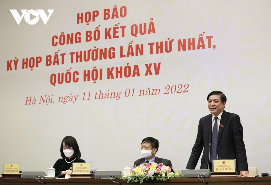 Der Generalsekretär des Parlaments Bui Van Cuong hält seine Rede auf der Pressekonferenz über Ergebnisse der ersten Sondersitzung. |