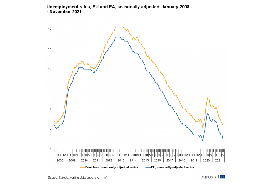 Trotzdem ist die Arbeitslosenrate in der Eurozone von 7,3 Prozent im Oktober auf 7,2 Prozent im November 2021 gesunken. Dies ist eine beachtliche Senkung der Arbeitslosenzahl gegenüber 2020 mit 8,1 Prozent in der Eurozone und 7,4 Prozent in der EU. Dies bedeutet, dass die Maßnahmen der europäischen Länder richtig und passend sind.