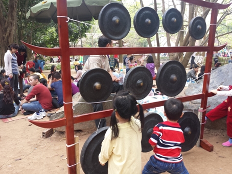 | Diese zwei Kinder schlagen das “chieng”, eine Art Musikinstrument aus Bronze. |