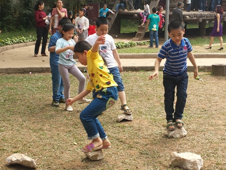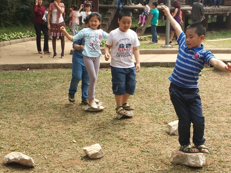 | In einem anderen Raum versuchen die Kinder mit dem Spiel “Durch den Bach gehen”. Der Hofboden gilt als Bach. Die Kinder müssen auf Steinen laufen, aber so, dass sie nicht in den Bach fallen. |