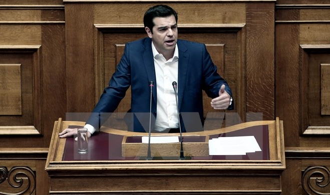 | Der griechische Premierminister Alexis Tsipras (r.) hält Rede bei der Verhandlung. (Foto: AFP/VNA) |