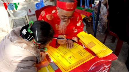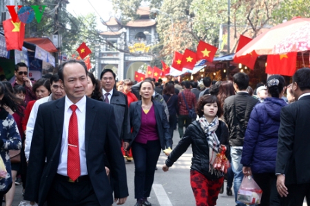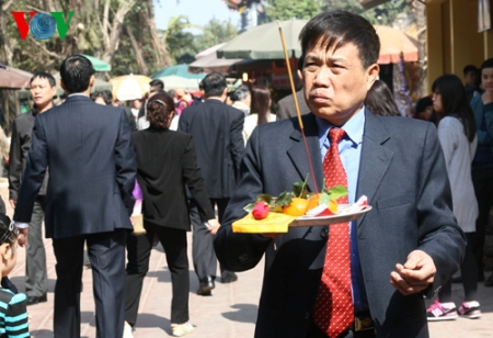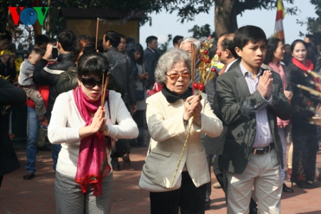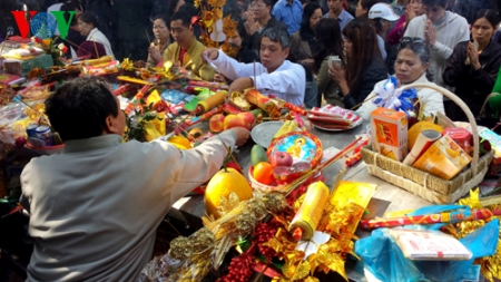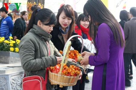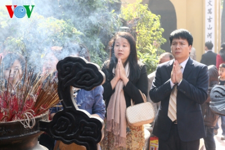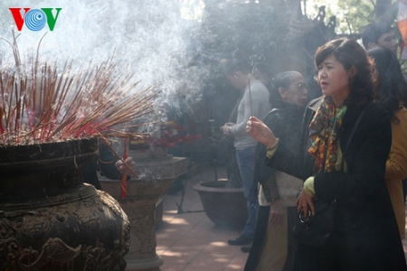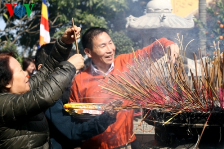 (VOVworld) – Pagoden am ersten Tag des Neujahrsfests Tet zu besuchen ist eine Tradition der Vietnamesen, die von Generation zu Generation weitergegeben wird. Die großen Pagoden in Hanoi wie beispielsweise Quan Thanh, Tran Quoc oder Tay Ho sind bereits am frühen Morgen sehr gut besucht. Die Hanoier kommen hierher, um für Glück und Gesundheit zu beten.