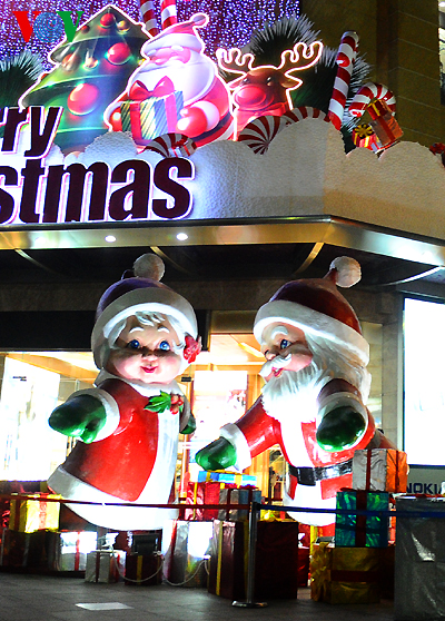 | Die meisten großen Handelszentren wurden mit Weihnachtsmännern und Weihnachtsbäumen dekoriert. |