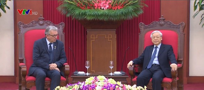 | KPV-Generalsekretär Nguyen Phu Trong trifft den Nationalsekretär der KPF, Pierre Laurent. (Foto: vtv.vn) |