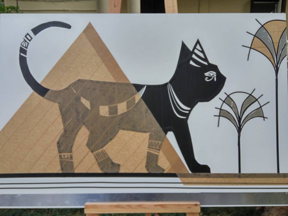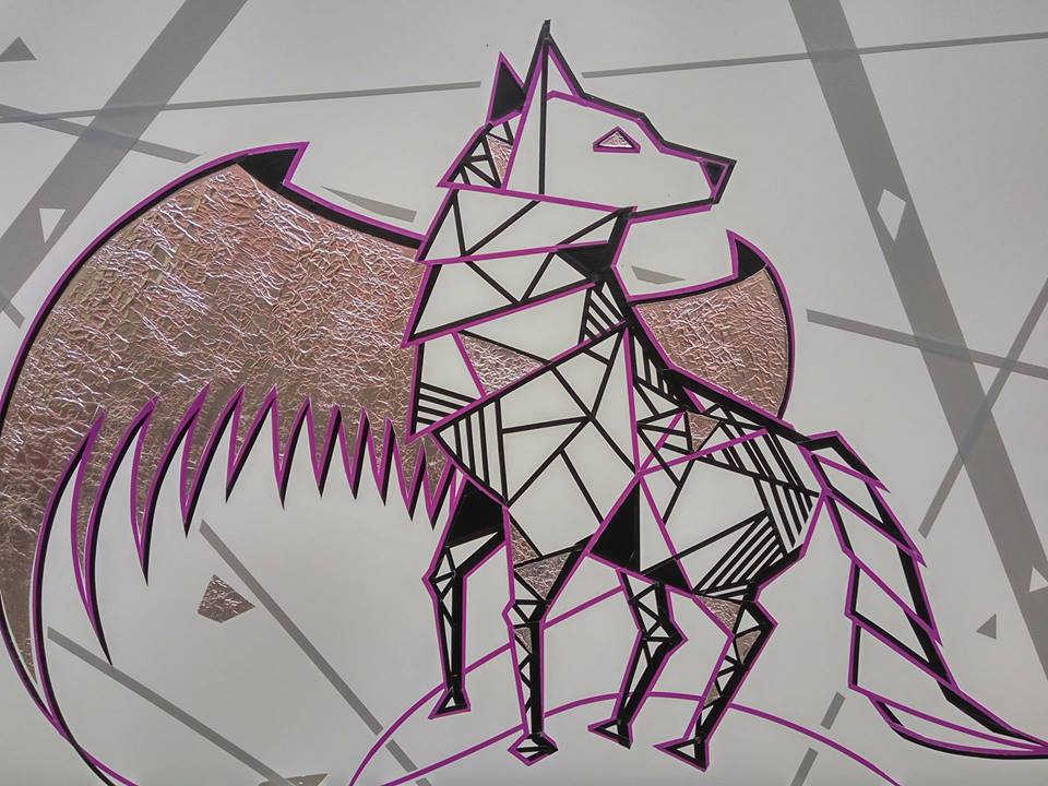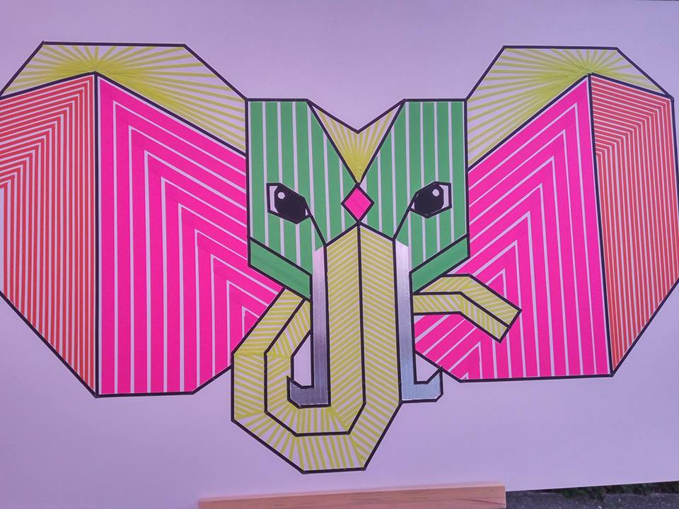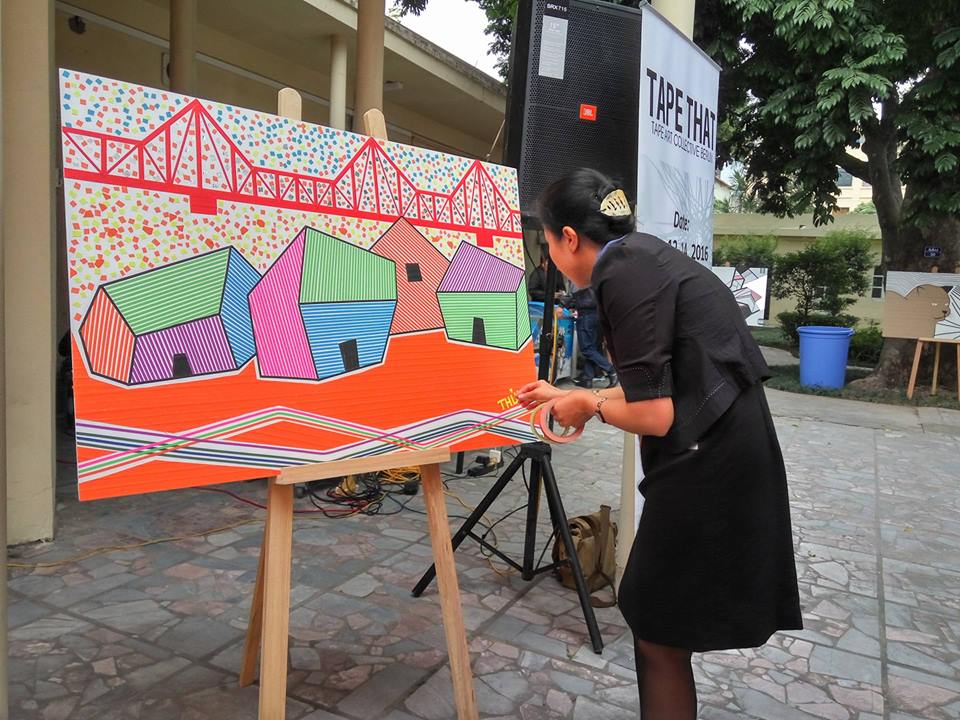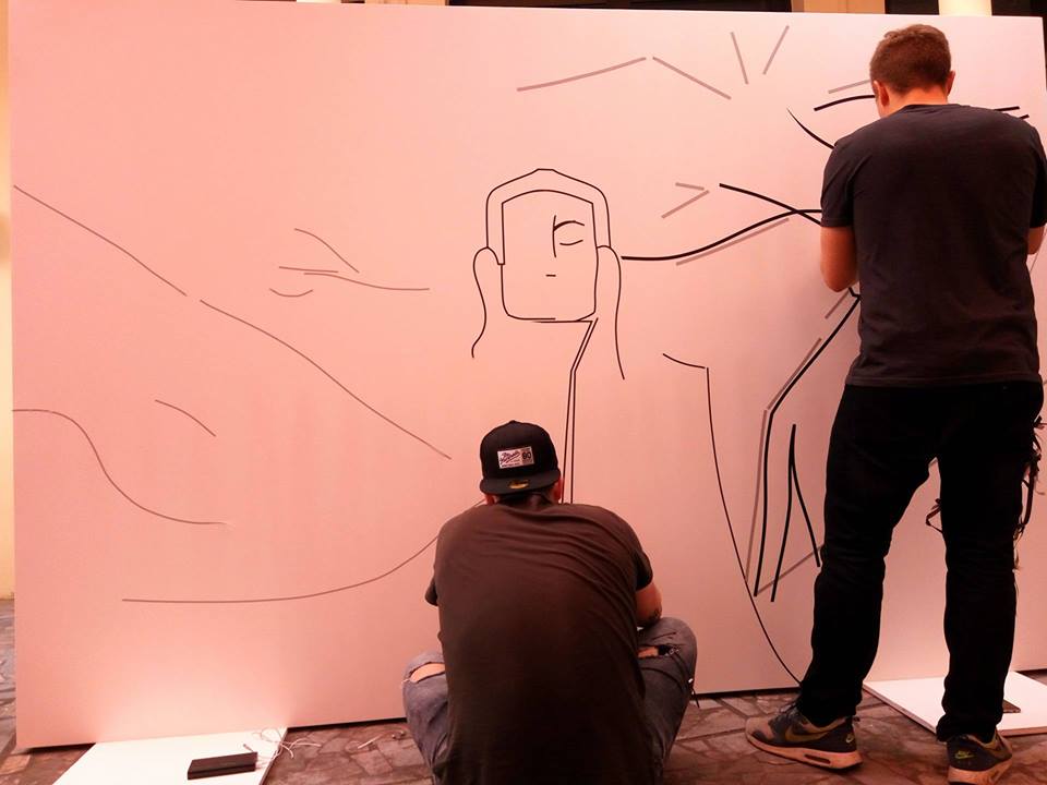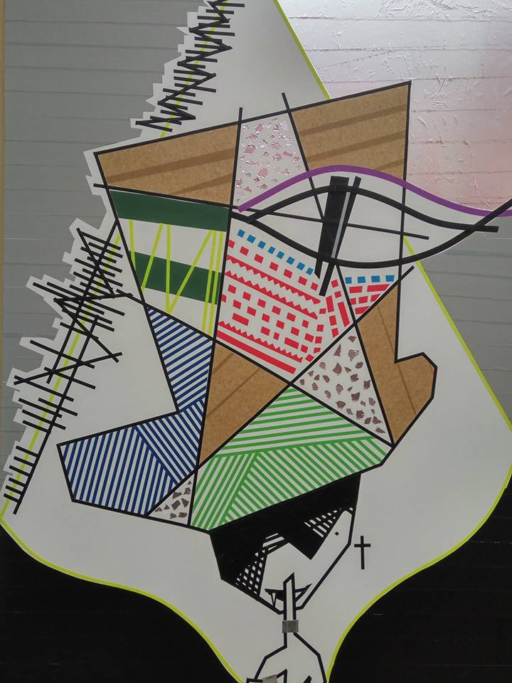 | Zwei weitere Mitglieder von Tape That gestalten ein Klebeband-Werk zum Thema Buddhismus. |