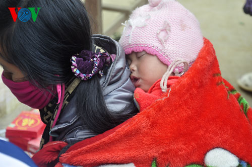 | Dieses Kind geht seit dem frühen Morgen gemeinsam mit der Mutter zum Markt. Es schläft nun auf dem Rücken der Mutter. |