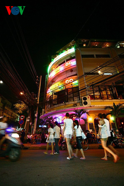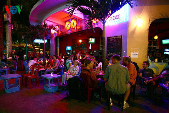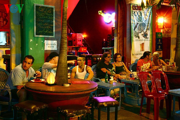 | Die Restaurants und Bars an der Ecke sind immer gut besucht. Sie haben eine gute Aussicht, wie hier in der Bar Go2 an der Ecke der De Tham und der Bui Vien-Straße. |