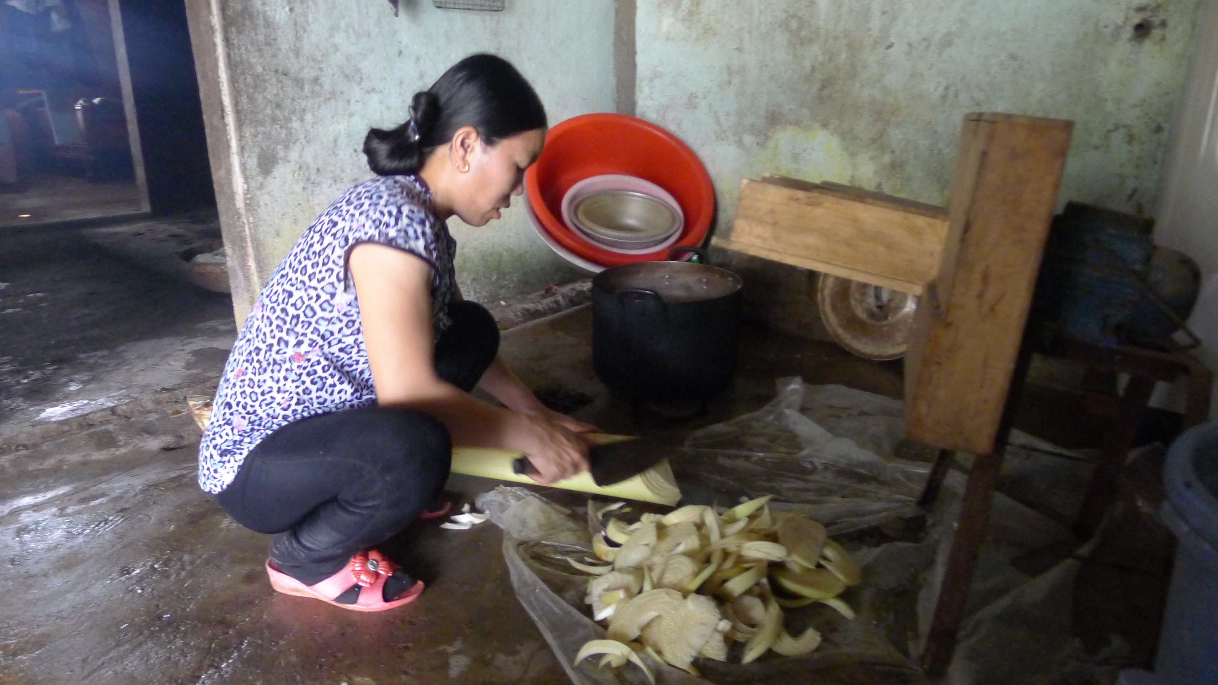 | Ninh Moc Sau bereitet sich auf Nahrungsmittel für die Tiere vor. |