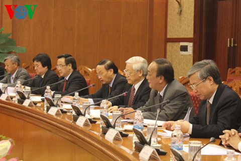 | Die vietnamesische Delegation unter Leitung des KPV-Generalsekretärs Nguyen Phu Trong (m.) bei dem Gespräch. (Foto: Vu Duy/Viet Dung) |