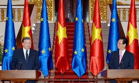 | Premierminister Nguyen Tan Dung (l.) und der Präsident der Europäischen Kommission, Jose Manuel Barroso, bei einem Besuch von Barroso in Hanoi. |