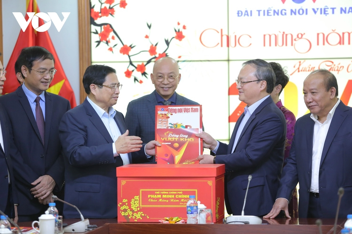 Premierminister Pham Minh Chinh beim Treffen mit VOV-Intendanten Do Tien Sy und Mitarbeitern. (Foto: Trong Phu) |