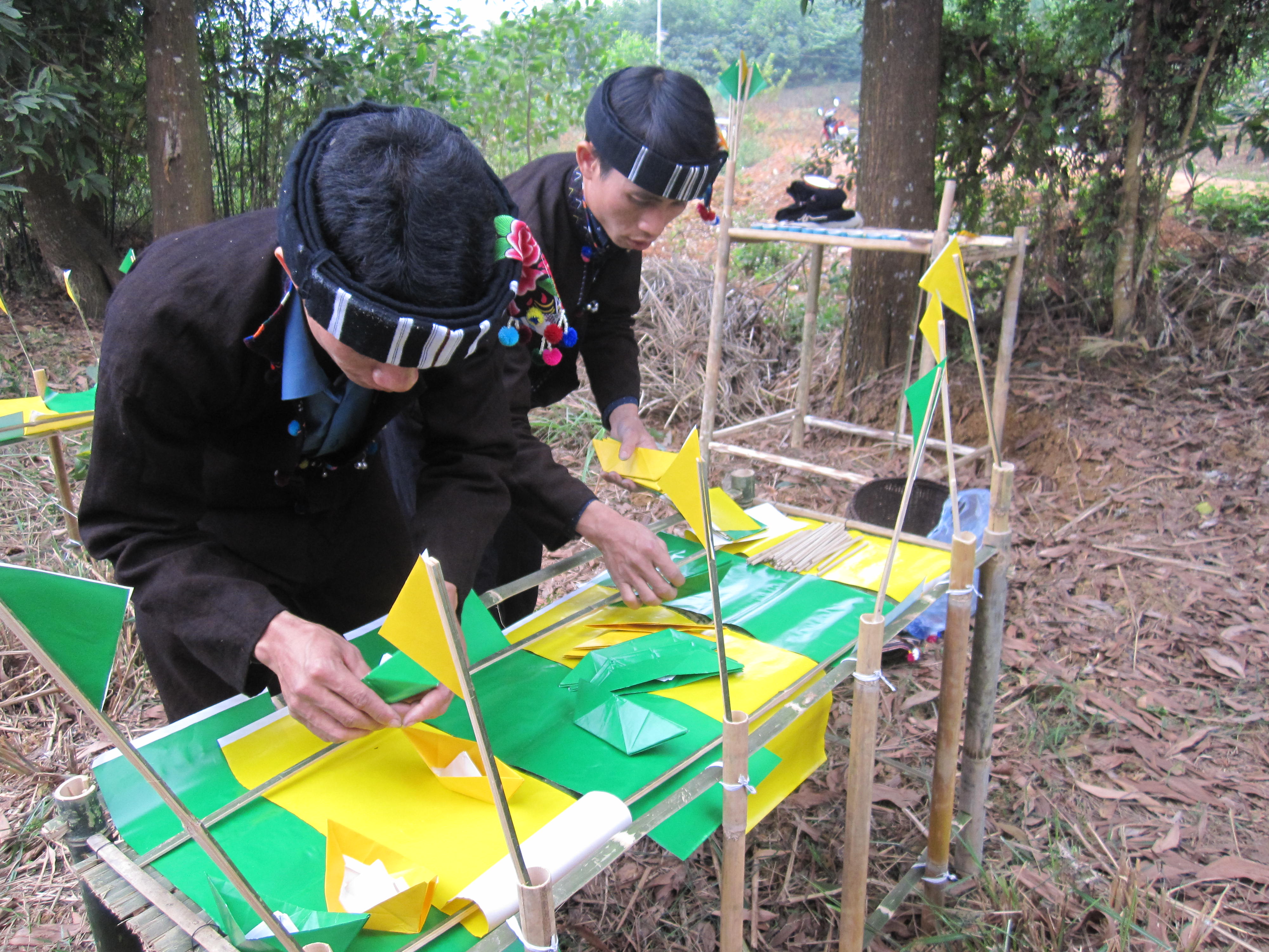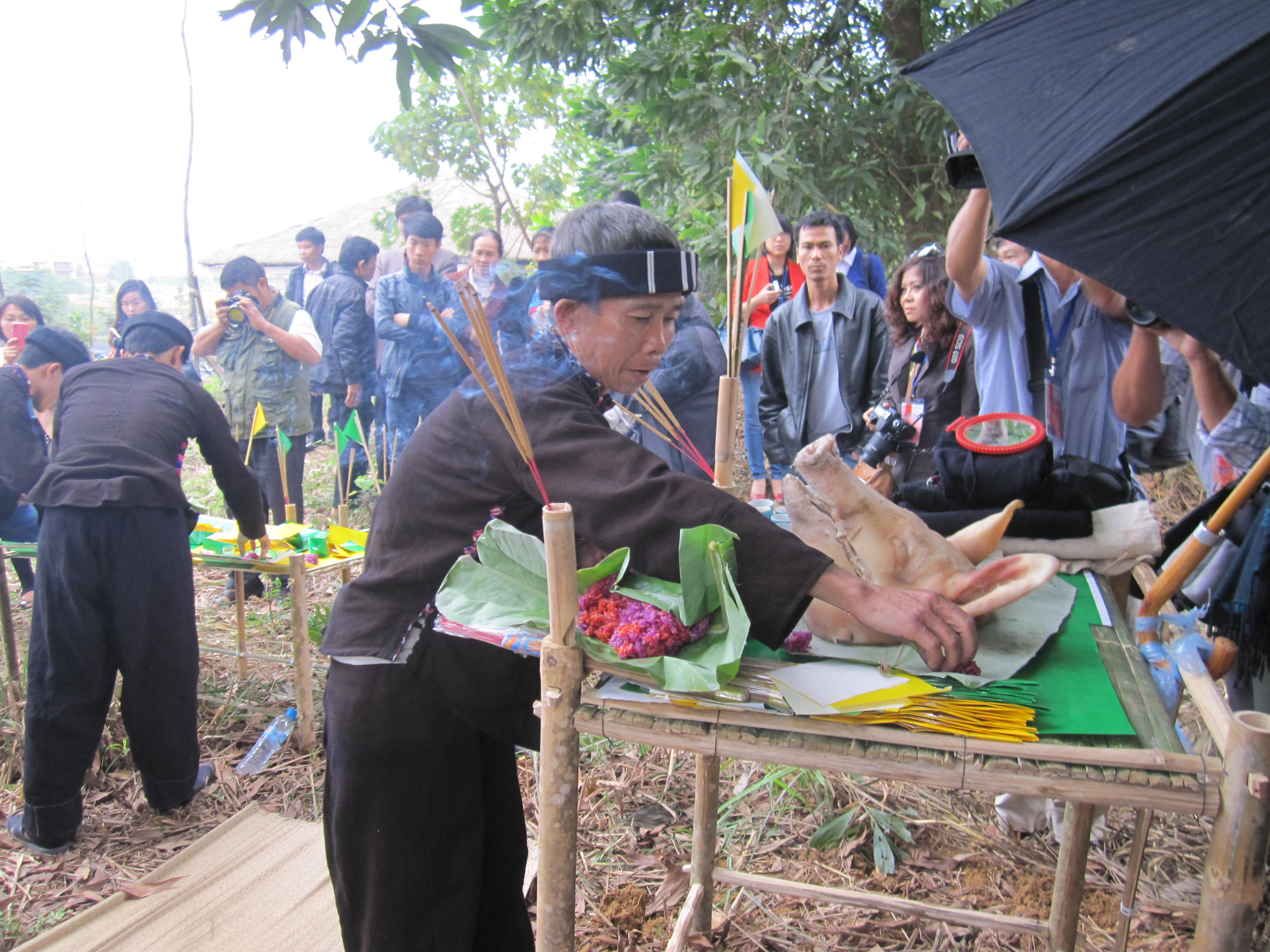 „Die Muong haben zahlreiche Verehrungstexte in ihrer Sprache für unterschiedliche Götter, wie den Küchengeist und den Erdgeist sowie Verehrungstexte für das Neujahrsfest Tet. Es dauert eine Stunde, um einen Verehrungstext fertigzustellen.“