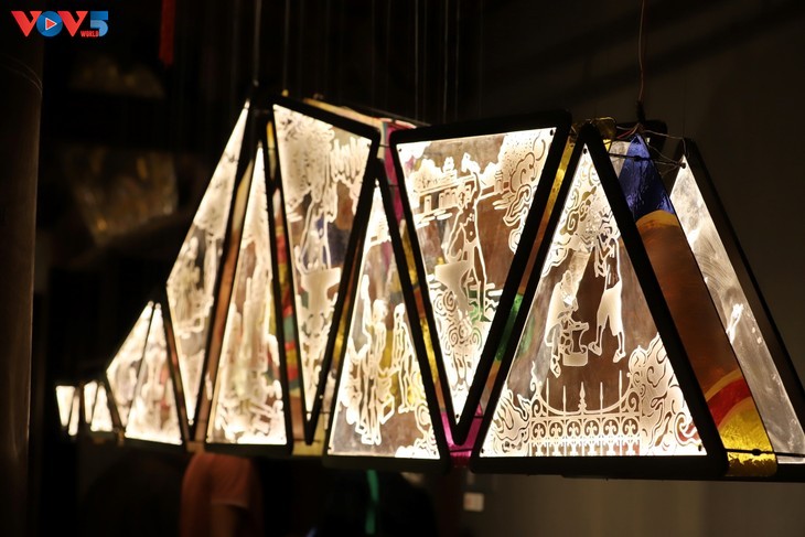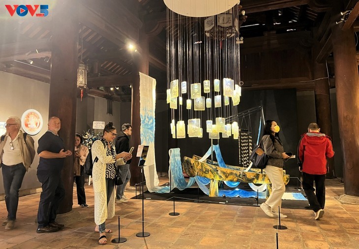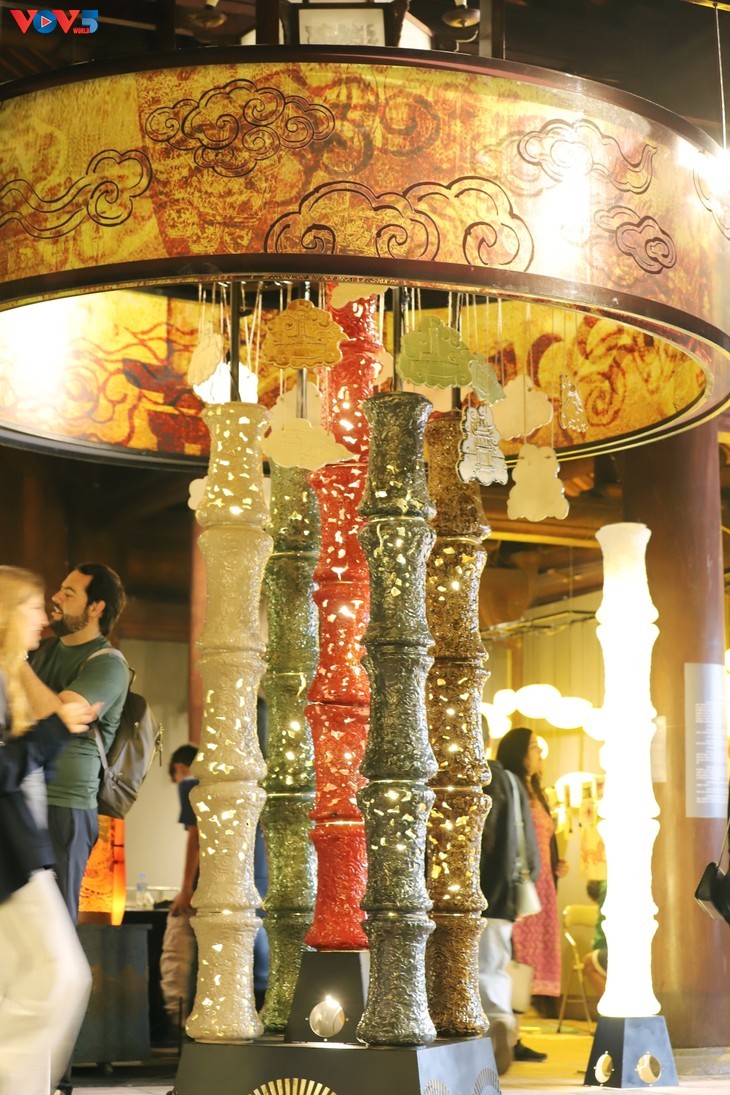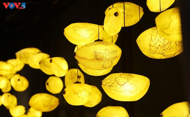| Künstler Vu Xuan Dong mit seinem Werk „Berühren“, das aus Laternen in Form des Reiskorns mit Dong Son-Mustern aus den Dynastien Dinh, Ly, Tran, Le und Nguyen besteht. |