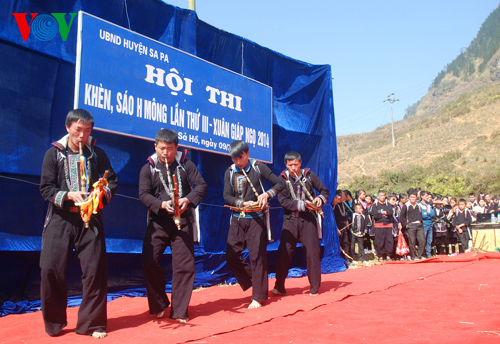 | Die Mong-Männer spielen das traditionelle Khen-Musikinstrument. |