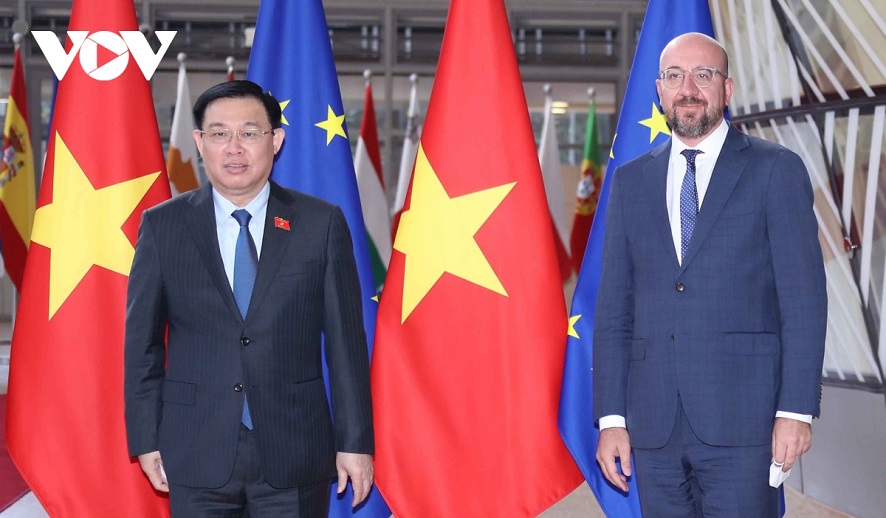 Er traf den Präsidenten des Europäischen Rates Charles Michel. Charles Michel sagte, er schätze den Besuch des vietnamesischen Parlamentspräsidenten in der EU. Die COVID-19-Pandemie hätte sich negativ auf die Umsetzung des Freihandelsabkommens zwischen Vietnam und der EU (EVFTA) ausgewirkt. Demnächst sollen beide Seiten das große Potenzial von EVFTA erschließen. Er teilte seine Auffassungen über Frieden und Sicherheit im indischen und pazifischen Ozean. Er sei für die Rechtsstaatlichkeit. Die EU wolle die Zusammenarbeit mit den Ländern in Südostasien einschließlich Vietnam vertiefen. Der Gast aus Vietnam erwiderte, dass die EU mit Vietnam Erfahrungen bei der nachhaltigen Entwicklung, digitalen Wirtschaft, grünen Wirtschaft und der Entwicklung von Fachkräften teile.