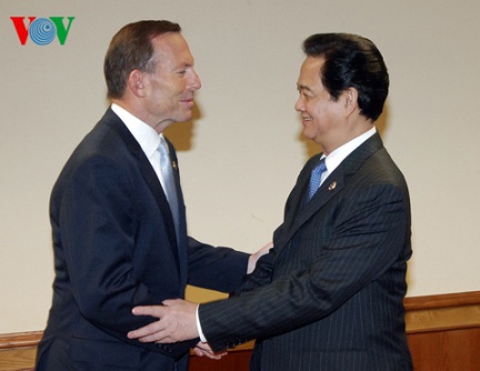 (VOVworld) – Premierminister Nguyen Tan Dung und sein australischer Amtskollege Tony Abbott haben bei einem Treffen am Rande des ASEAN-Gipfels Maßnahmen diskutiert, um künftig die Beziehungen zwischen Vietnam und Australien voranzutreiben. Premier Dung forderte dazu auf, dass beide Seiten bald über ein Abkommen zur Justizunterstützung verhandeln sollten. Auch ein Abkommen über das sogenannte Working Holiday Program solle bald unterzeichnet werden, so der vietnamesische Premier. Er brachte zudem den Wunsch zum Ausdruck, dass Australien weiterhin den gemeinsamen Standpunkt der südostasiatischen Staatengruppe ASEAN über die Ostmeer-Frage sowie die Lösung der Streitigkeiten im Meer durch friedliche Maßnahmen und auf Grundlage der internationalen Gesetze unterstützen werde.