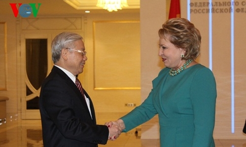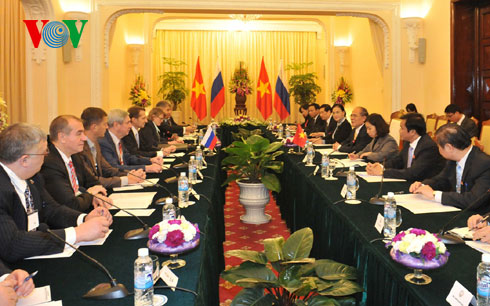 (VOVworld) – Russland ist der wichtigste Partner und der führende Waffen-Exporteur Vietnams. Dies sagte Parlamentspräsident Nguyen Sinh Hung bei einem Treffen mit dem Vorsitzenden der Staatsduma Russlands, Sergei Jewgenjewitsch Naryschkin am Dienstag in Hanoi. Nguyen Sinh Hung bekräftigte, dass gemeinsam mit Russland Vietnam die bilaterale Beziehung auf ein neues Niveau heben wolle. Seinerseits drückte der Dumachef seine Hoffnung aus, dass Ergebnisse der Verhandlungen über das Freihandelsabkommen zwischen Vietnam und der Zollunion Russlands, Kasachstans und Weißrusslands, die Anfang 2015 veranstalten werden, die Beziehungen in den Bereichen Handel und Investition zwischen beiden Ländern fördern würden. Künftig werde Russland stärker mit Vietnam in den Bereichen Nano-, Laser-, Bio- und Informationstechnologien zusammenarbeiten.