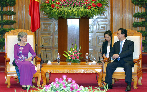 (VOVworld) – Am Donnerstag hat Premierminister Nguyen Tan Dung die Generaldirektorin der UN-Kulturorganisation UNESCO Irina Bokova in Vietnam empfangen. Beim Treffen betonte der Premier, Vietnam lege großen Wert auf die Arbeite der UNESCO weltweit und wolle die allseitige Kooperation vertiefen. Er äußerte den Wunsch, dass die UNESCO Vietnam weiterhin bei der Ausbildung seiner Arbeitskräfte im Kulturbereich unterstützen werde. Die UNESCO sollte weitere vietnamesische Bewerbungen für das Weltkulturerbe unterstützen. Darunter zählten die Landschaft in Trang An in der Provinz Ninh Binh, die Cat Ba-Insel, der Amateur-Gesang im Süden sowie die folkloristischen Vi- und Dam-Gesänge. UNESCO-General-Direktorin Irina Bokova betonte, Vietnam spiele eine wichtige Rolle bei der Stärkung der Zusammenarbeit zwischen den UNESCO-Mitgliedern. Sie würdigte die Anstrengungen Vietnams, seine Weltkulturschätze zu bewahren sowie die Fortschritte bei der Ausbildung und beim Kampf gegen den Klimawandel. Sie betonte, die UNESCO werde Vietnam weiterhin seine Erfahrungen für die nachhaltige Entwicklung in den Fachbereichen teilen. Sie äußerte den Wunsch, dass die südostasiatische Staatengruppe ASEAN und die UNESCO so bald wie möglich eine Vereinbarung zur Kooperation unterzeichnen würden.