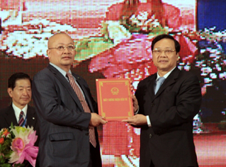 | Der Vorsitzende des Volkskomitees der Provinz Ninh Binh Bui Van Thang (r.) überreicht einem Unternehmer Investitionsgenehmigung. (Foto: Chinhphu.vn) |
