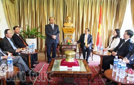 (VOVworld) – Während seines Aufenthalts in Singapur hat Vize-Premierminister Nguyen Xuan Phuc am Montag Mitarbeiter der vietnamesischen Botschaft und anderer Vertretungen Vietnams in Singapur getroffen. Phuc betonte, dass die Investitionstätigkeiten Singapurs in Vietnam sehr lebhaft seien. Das effziente Modell der vietnamesisch-singapurischen Industriezone (VSIP) solle erweitert werden. Während seines Singapurbesuchs wird Nguyen Xuan Phuc Premierminister Singapurs Lee Hsien Loong und Chefs führender Unternehmen dieses Landes treffen.
