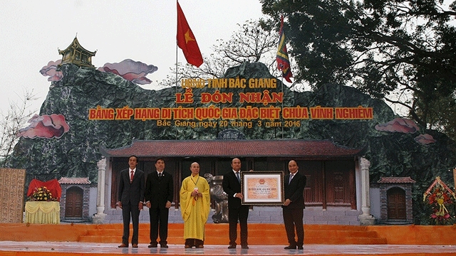 | Vizepremierminister Nguyen Xuan Phuc überreicht Urkunde an Vertreter der Pagode Vinh Nghiem. (Foto: Dang Giang) |