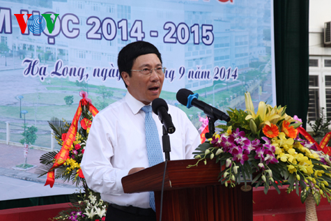 (VOVworld) – Vizepremierminister Pham Binh Minh hat am Freitag an der Feier zum Schulbeginn der Eliteschule Ha Long in der nordvietnamesischen Provinz Quang Ninh teilgenommen. Er lobte die Bemühungen sowie die Erfolge der Lehrer und Schüler im vergangenen Schuljahr. Der Vizepremierminister forderte das Bildungswesen der Provinz sowie die Eliteschule Ha Long auf, die Bewegung des Wettbewerbs bei gutem Lehren und gutem Lernen durchzuführen:
