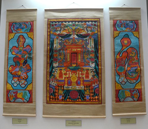 Anders als Dong-Ho-Bilder und Hang-Trong-Bilder werden die Kim-Hoang-Bilder auf rotem Papier gedruckt. Sie sind meist Blutrot, Rosenrot und Orangerot. Die Themen der Kim-Hoang-Bilder sind lebensnah und einfache Sachen für die Bauern wie Hahn, Schwein, Landschaft und Küchenheilige. Die Bilder hängte man damals an die Wand als Dekoration zum Neujahrsfest Tet. Es gab aber auch Dekorationsbilder für den Altar. Nguyen Sy Tien weiter: