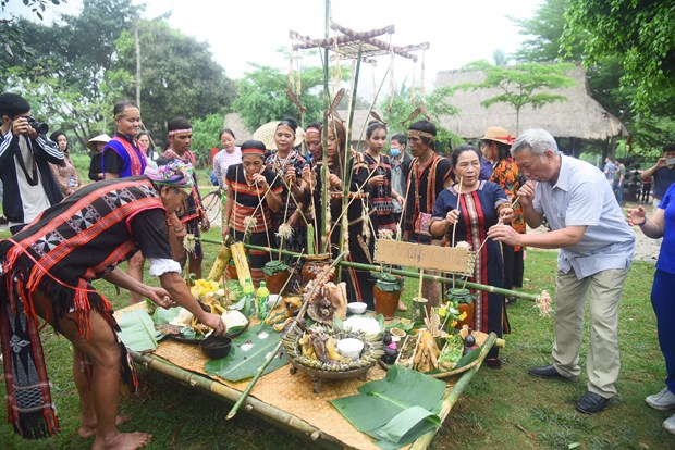 Die Opfergaben sind unter anderem Neu-Baum, Hühnerfleisch, Schweinekopf, Reis und Schnaps. Der Führer des Rituals ist normalerweise der Dorfälteste - eine Respektsperson im Dorf. Zum Abschluss der Veranstaltung feiern die Dorfbewohner mit Essen, Singen, Tanzen im Gong-Schlag.