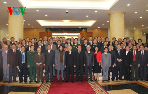 (VOVworld) – Am Donnerstag hat das Parteisekretariat ausgezeichnete Wissenschaftler, Akademiker und Künstler aus dem ganzen Land getroffen. Das ist das dritte Jahr in Folge, dass das Parteisekretariat dieses Treffen organisiert. KPV-Generalsekretär Nguyen Phu Trong sagte, die Errungenschaften des Landes im vergangenen Jahr seien den Leistungen der Partei, der ganzen Bevölkerung, darunter insbesondere den Akademikern, Wissenschaftlern und Künstlern zu verdanken. Die Kommunistische Partei Vietnams lege großen Wert auf die Rolle der Wissenschaftler, Akademiker und Künstler. Dies werde durch zahlreiche Parteibeschlüsse bewiesen, vor allem mit dem Beschluss zur Entwicklung der Kultur, Ausbildung und Wissenschaft.