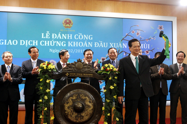| Premierminister Nguyen Tan Dung schlägt den Gong zum Auftakt der Börse des Jahres der Ziege. (Foto: vietnamnet.vn) |