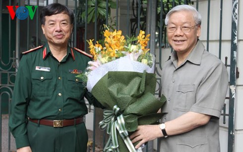 | KPV-Generalsekretär Nguyen Phu Trong (r.) besucht die Volkarmee-Zeitung. |