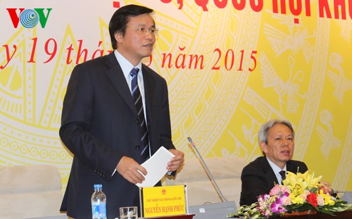 (VOVworld) – Nach dem Abschluss der Parlamentssitzung hat das Parlamentsbüro eine Pressekonferenz organisiert. Dabei berichtete der Leiter des Parlamentsbüros Nguyen Hanh Phuc, das Parlament habe auf der Sitzung das geänderte Gesetz zur Organisation der Regierung, das Gesetz zur Organisation der Lokalbehörden und das Gesetz für die Vaterländische Front Vietnams verabschiedet. Das seien wichtige Gesetze, die andere Gesetze beeinflussen können. Nguyen Hanh Phuc betonte, es gebe vieles Neues bei der Fragestunde, die zur Verbesserung der Aufsicht des Parlaments diene.