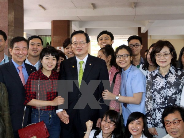 | Südkoreas Parlamentspräsident Chung Ui-wha und Studenten der Hochschule der Sozialwissenschaft und Humanität in Ho Chi Minh Stadt. (Foto: Thanh Vu/VNA) |