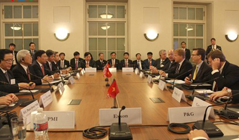 (VOVworld) – KPV-Generalsekretär Nguyen Phu Trong und Vertreter führender US-Unternehmen haben am Mittwoch an einem Rundtisch-Gespräch teilgenommen. Dabei informierte Nguyen Phu Trong über die Wirtschaftslage Vietnams sowie über Maßnahmen zur Förderung der Zusammenarbeit in den Bereichen Wirtschaft, Handel und Investition zwischen Vietnam und den USA. Vertreter führender US-Unternehmen drückten ihre Hoffung aus, dass das transpazifische Wirtschaftspartnerschaftsabkommen, das gerade ausgehandelt wird, Chancen zur Zusammenarbeit in den Bereichen Handel und Investition zwischen den USA und Vietnam bringen werde.