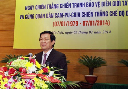 En su discurso leido en este mitin, el jefe de Estado vietnamita reafirmó que hace 35 años, los pueblos vietnamita y camboyano anhelaban vivir en paz para restaurar y desarrollar sus países tras numerosos años de guerra, sin embargo la camarilla de Pol Pot, Ieng Sary y Khieu Samphan practicó la política de genocidio en Cambodia e invadió la frontera suroccidental de Vietnam. Dunrante 3 años 8 meses y 20 días el régimen de Pol Pot masacró a cerca de 3 millones de camboyanos, borró todas las bases sociales y empujó al pueblo camboyano al desastre de exterminio.