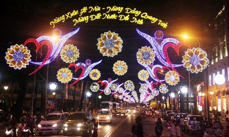 En ciudad Ho Chi Minh, millones de bombillos multicolores fueron engalanados en el área central, plaza y edificios entre estos, Bitexco, la construcción más alta de la urbe. Este año, la calle floral Ham Nghi, en el primer distrito, tiene el tema “Identidad y Espíritu de Vietnam” con la imagen de la cabra como fuente de inspiración. Tran Bien, residente local, comentó: “La calle de flores de este año muestran la creatividad y habilidad de los empleados de Saigontourismo y artistas plásticos, deleitando a los visitantes. Está muy bonita y no defrauda el deseo de la mayoría de urbanos y turistas en el Tet.”