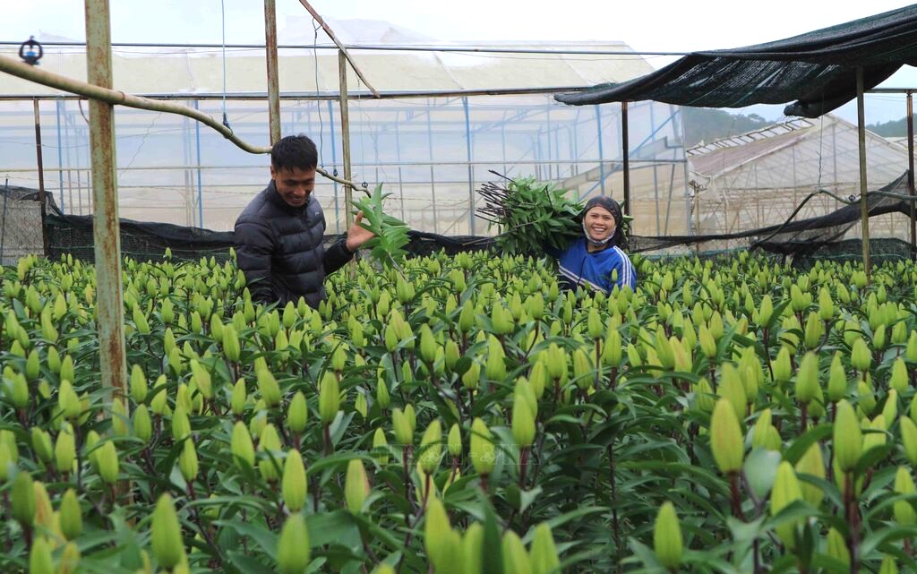 Agricultores de Thai Phien (Barrio 12, Da Lat) en plena cosecha de lirios. (Foto: VNA) |