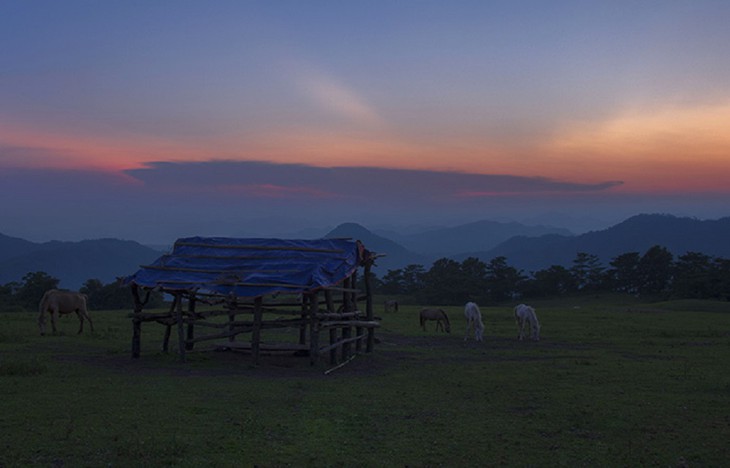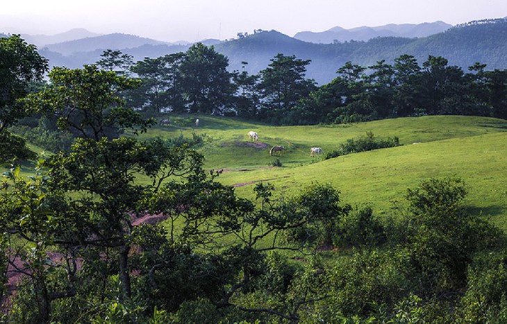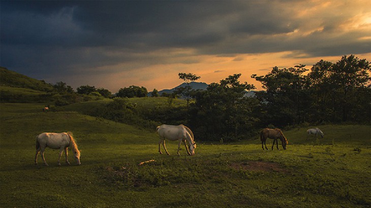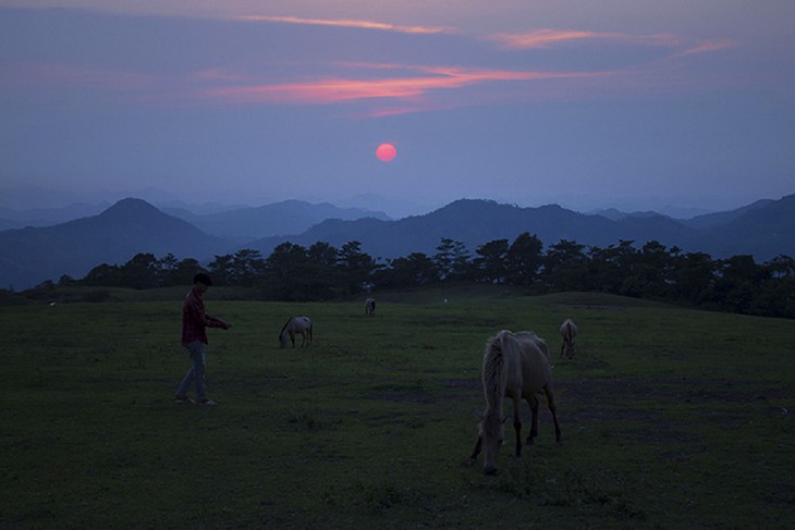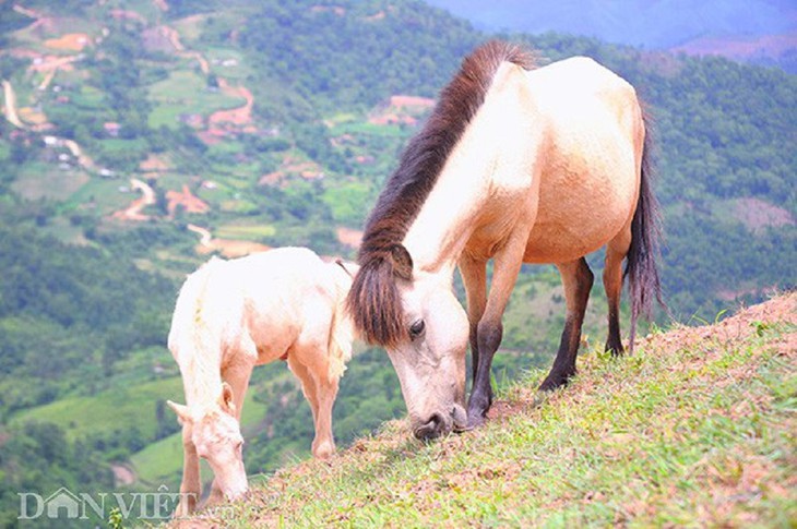 Los caballos blancos pastando pacíficamente crean bellas imágenes de Khau Sao. (Foto: baolangson.vn) |